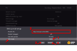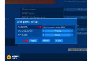 Step 3: First change the API Mode to “MAG” then on the “Portal URL:” enter your portal server address (you can ask for this info from your IPTV distributor) and click on “Apply” and “Restart“.