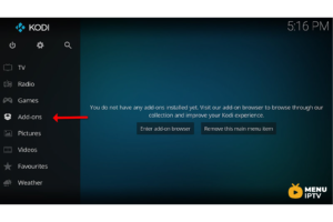 - Turn on your device and open Kodi.